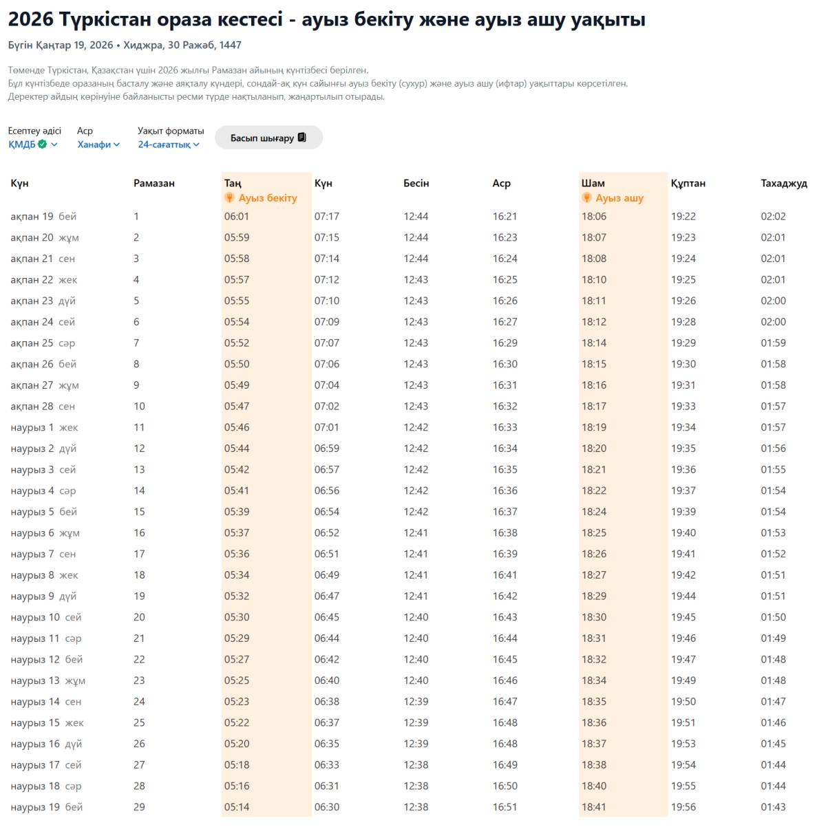 Түркістан қаласы бойынша 2026 жылғы Рамазан айының уақыты белгілі болды. Мұсылман қауымы үшін қасиетті ай 19 ақпанда басталып, 19 наурызда аяқталады.