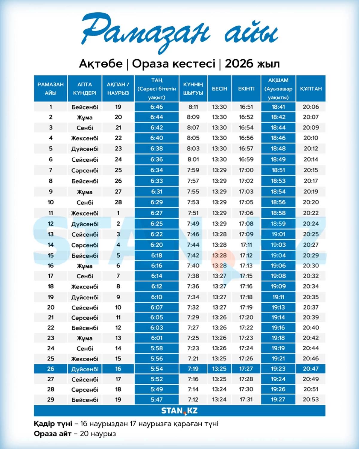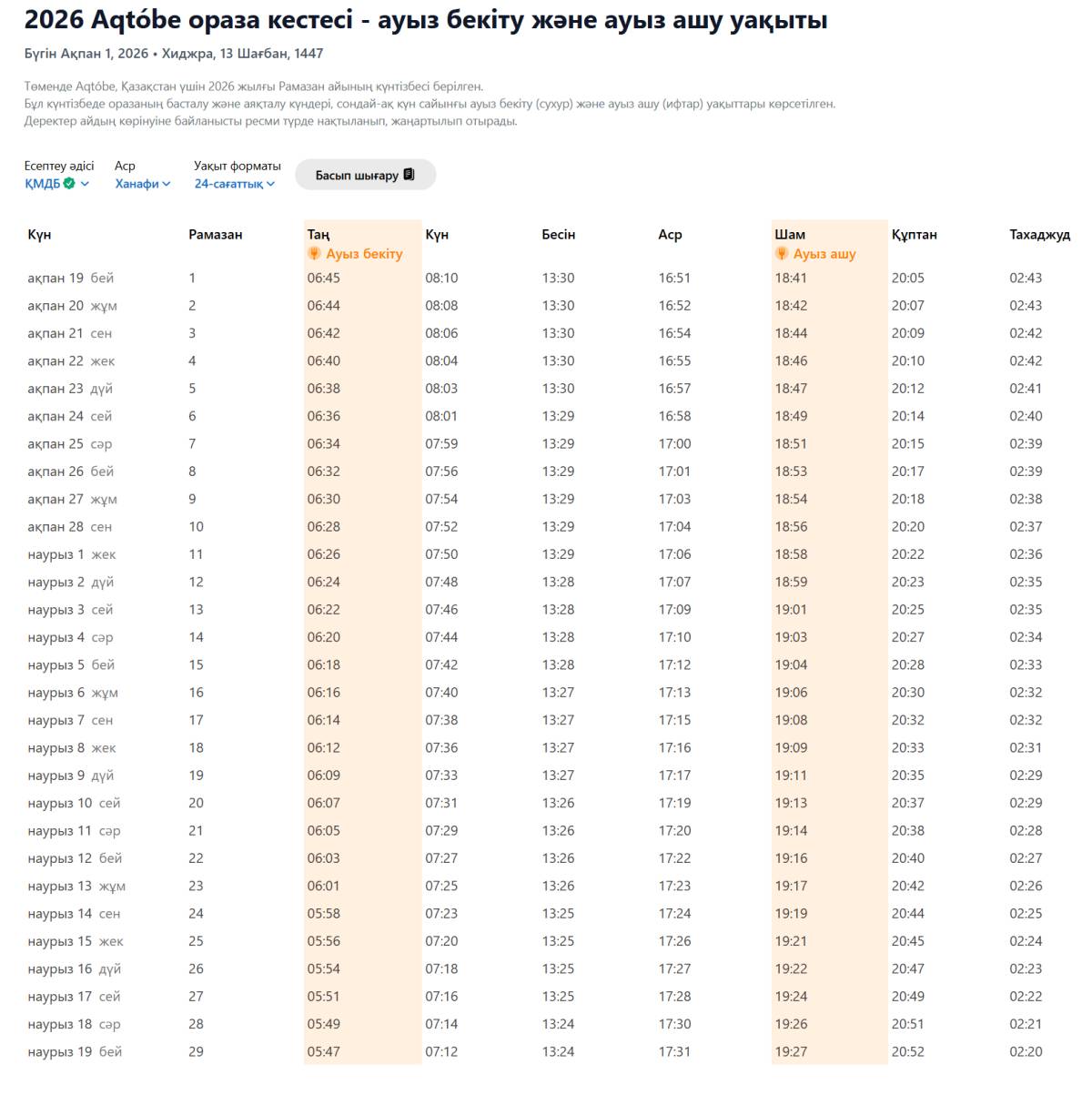 Ақтөбе қаласында 2026 жылғы Рамазан айының кестесі белгілі болды. Қасиетті ай 19 ақпанда басталып, 19 наурызда тәмамдалады.